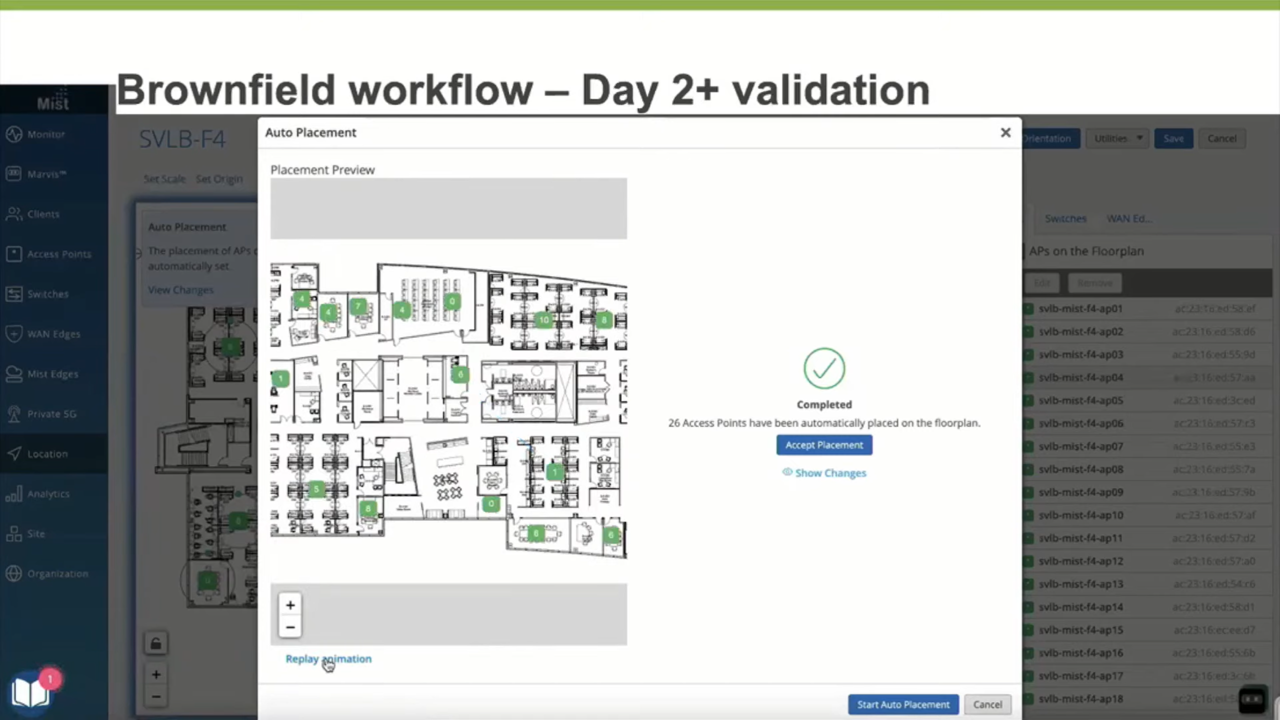 既存の導入済みのフロアマップの検証イメージです。デモとしてはAPが逆に設置されていた間違いを検知し、自動的に修正する内容となっています。