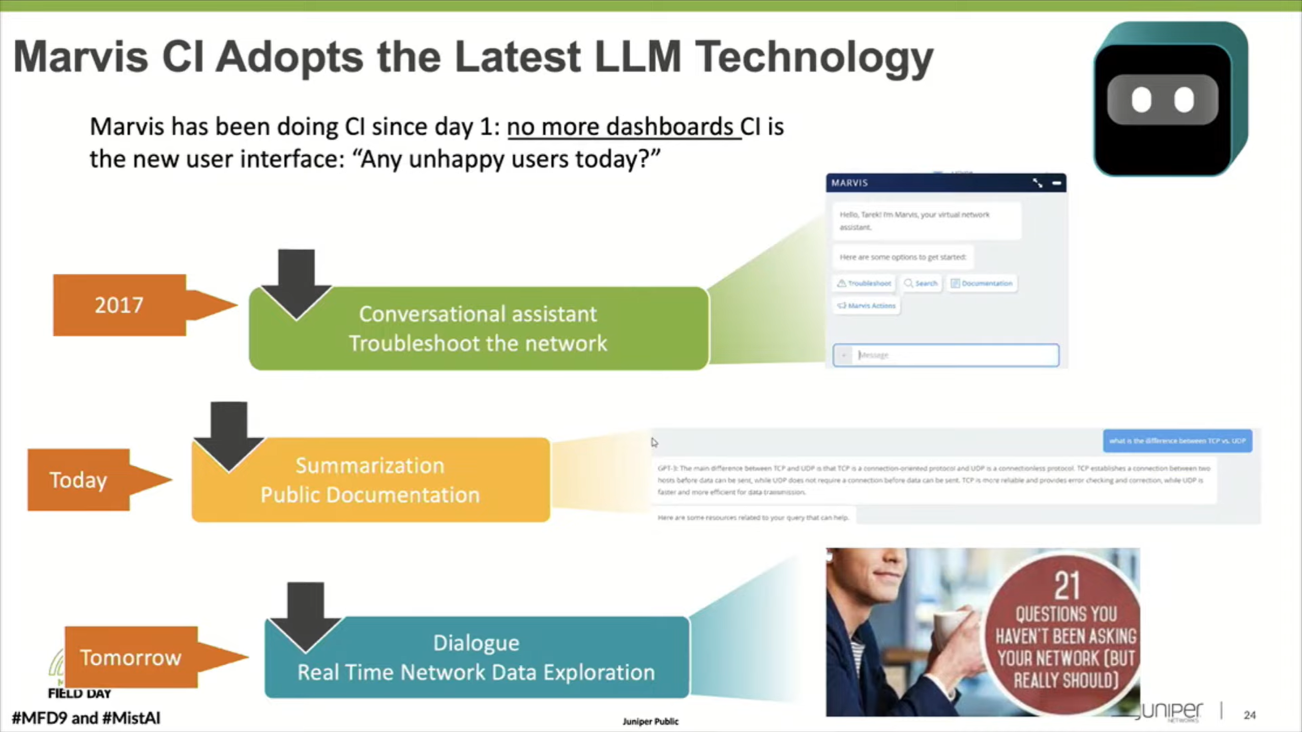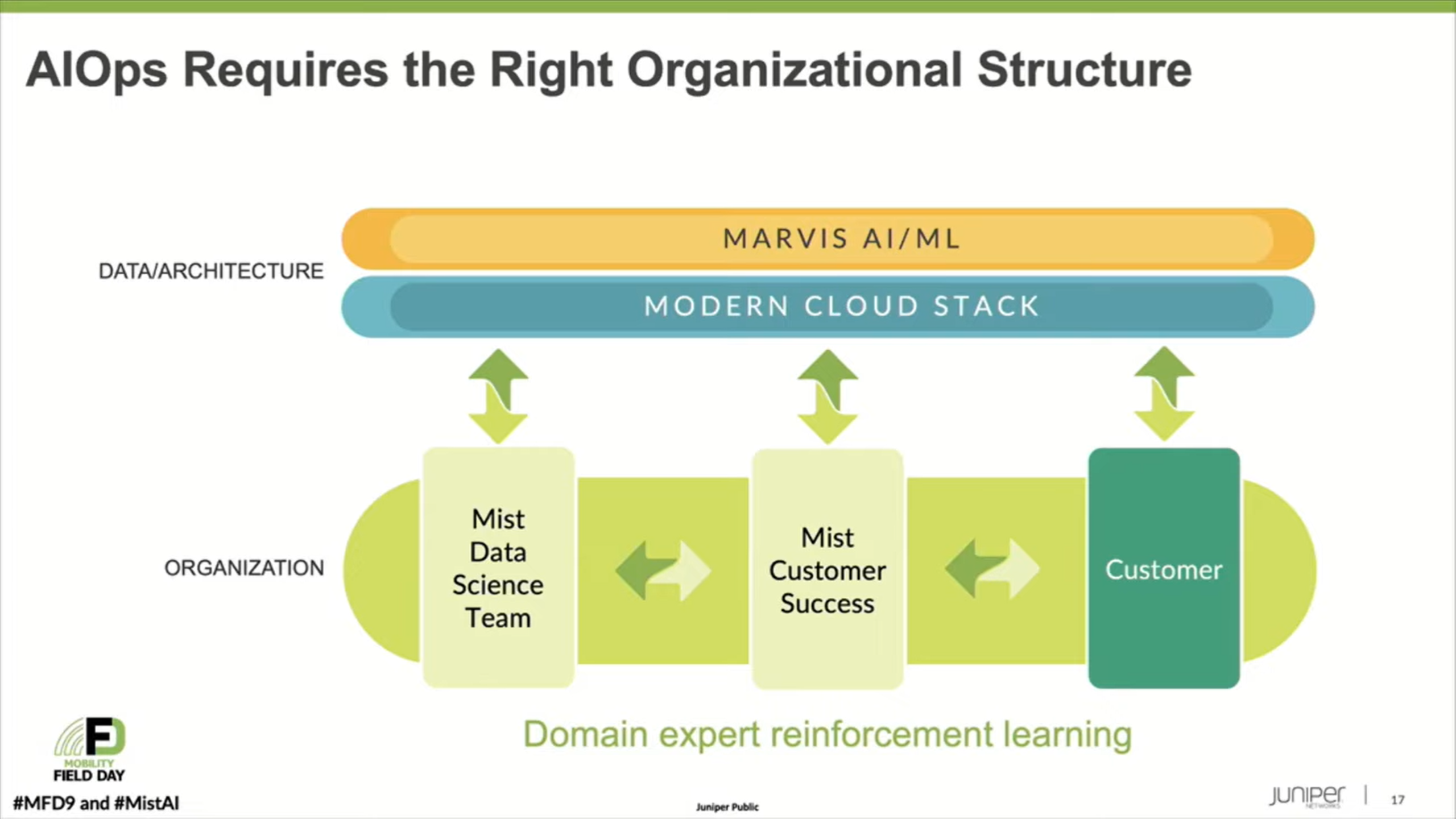 Mistではカスタマーサポートチームとデータサイエンスチームが文字通り席を並べて常にコミュニケーションを取りながら業務を進めています。ここでいう"Domain expert reinforcement learning"とは、ネットワークのスペシャリストが実際のケースで切り分けを行った結果をMarvisに学習させることで、Marvisが過去の事例の傾向を学習し、類似の事象が発生した際に過去の事例をもとにトラブルシューティング行えるように継続的な学習を行わせていることを意味しています。