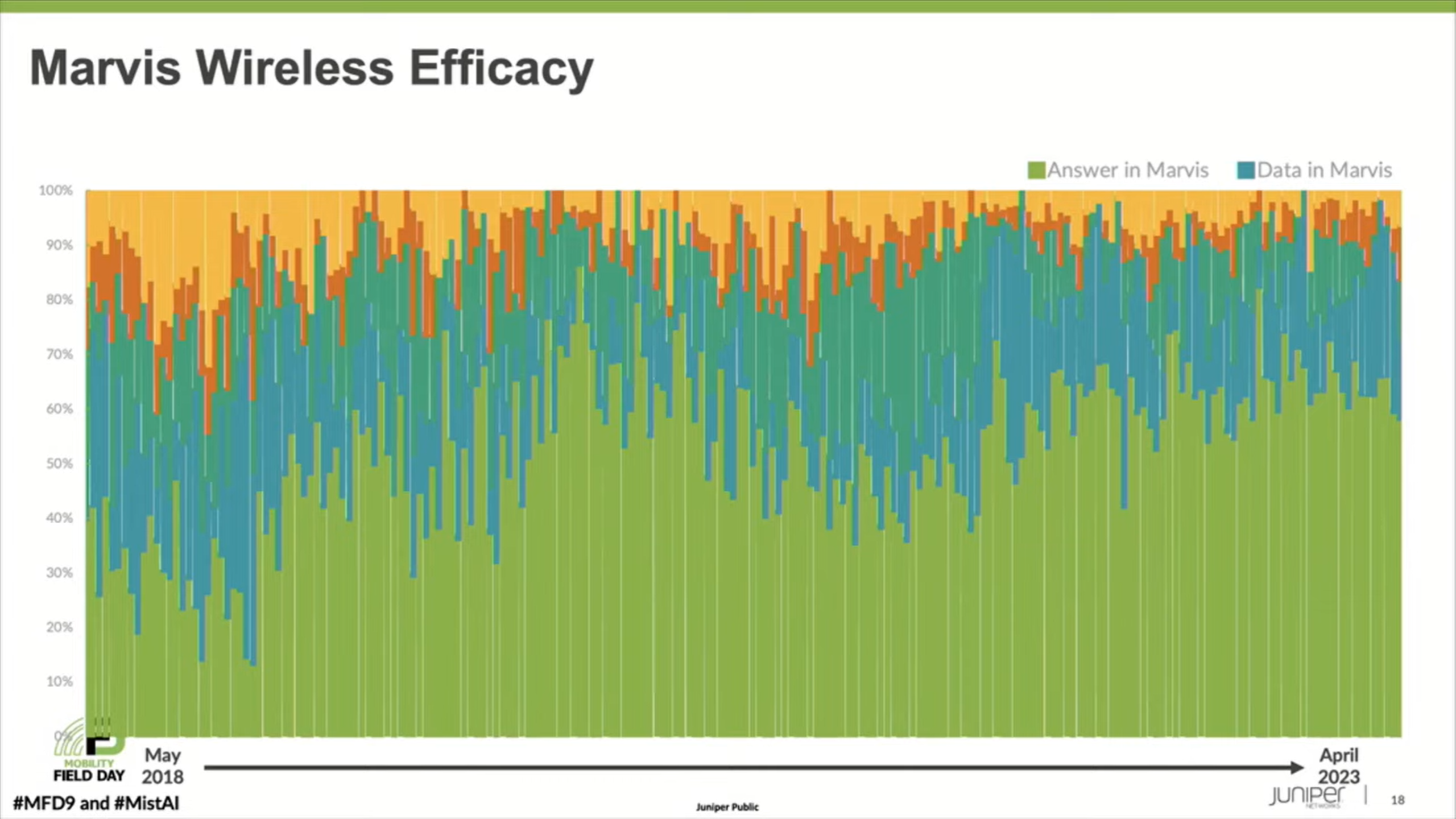 Mistのカスタマーサポートは必ず受け取った質問をまずMarvisに問い合わせます。以下のグラフはMarvisが質問に対する回答を持っていたケース、あるいは質問に回答するために必要であったデータを有していたケースの割合を時系列で示しています。
