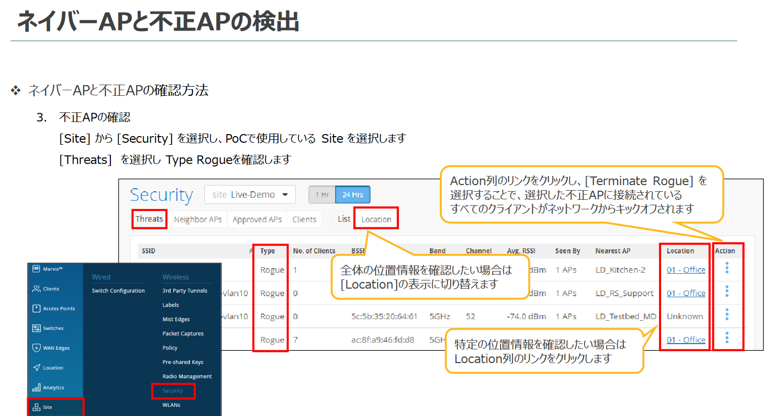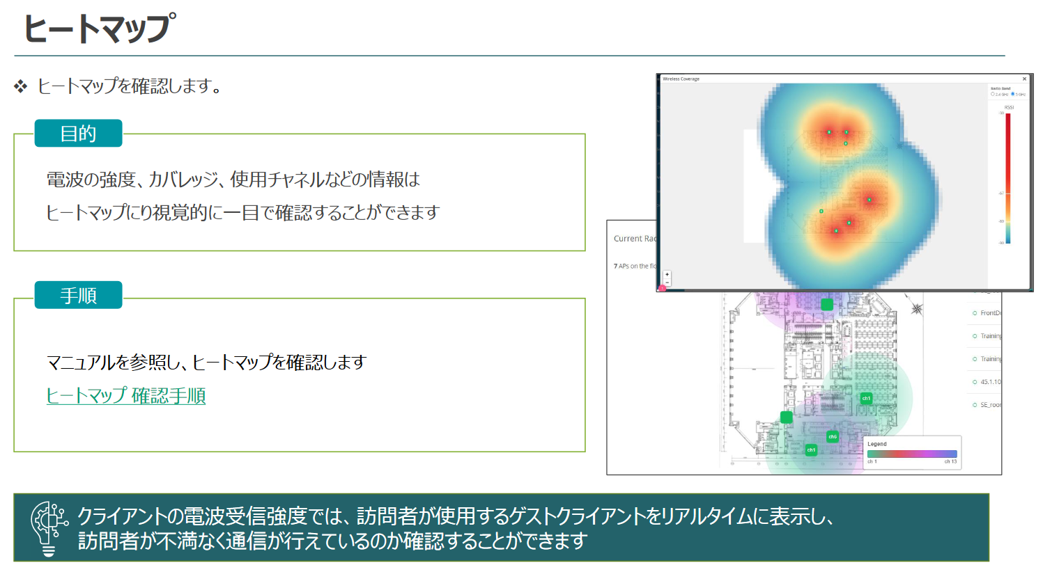 PoCガイド(4)テストシナリオ Day2 - 運用 - 2023年08月15日 05:55 更新 PoCガイド Day1 に続き、運用(Day2~)に関するテストシナリオです。 Mist検証手引きPoCテストシナリオ Day2 - 運用 - スライド抜粋:ヒートマップ スライド抜粋:自動電波調整 スライド抜粋:ネイバーAP、不正APの検出 Mist検証手引きPoCテストシナリオ Day2 - 運用 - 関連記事 PoCガイド(5)報告書記載例 PoCガイド(3)テストシナリオ Day1 - 構築 - PoCガイド(2)テストシナリオ Day0 - 設計 - PoCガイド(1)PoC事前準備 【定期開催】 Junos ハンズオントレーニング