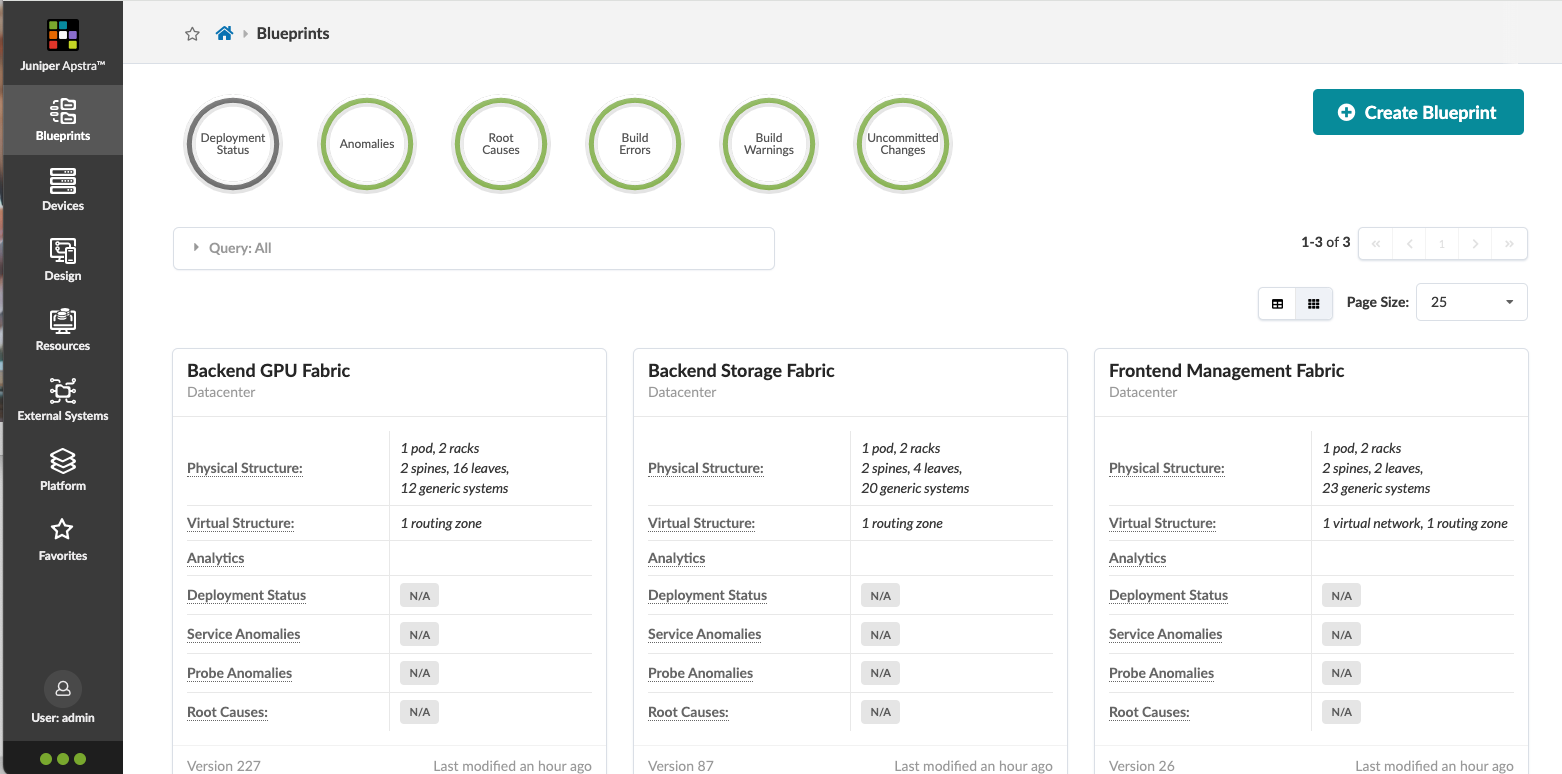 Apstra により Rails 構成を標準化する Juniper Apstra をご存じの方は、 複数のファブリックを同じ Apstra インスタンス内のブループリントとして管理できることを知っていると思います。すなわち、AI clusterで利用する各専用ネットワークをひとつのコントローラーで管理するということができます。もしApstraをご存知ない方は、こちらの記事も参考にしてください。