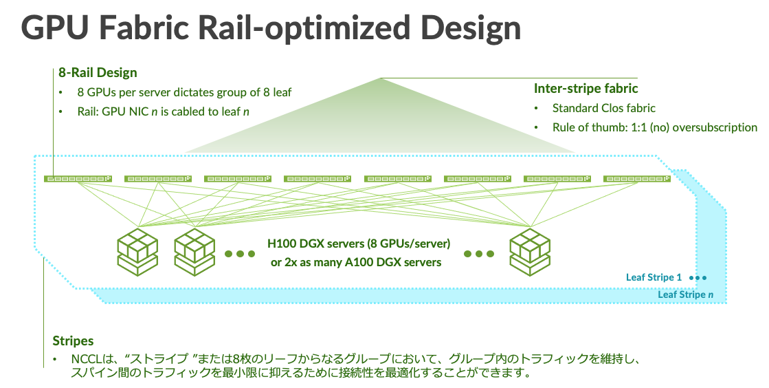 rail optimizedされた設計は、NVIDIA Collective Communications Library (NCCL) と呼ばれる複数GPU のための集合的な標準コミュニケーションルーチンのライブラリ、および、 PXN 機能 と呼ばれる内部リンクやPCI通信の技術により、ネットワーク トポロジを検出し、通信遅延を最適化することからデザインされています。つまり、GPU間の通信を最適化するデザインと機能を提供しています。