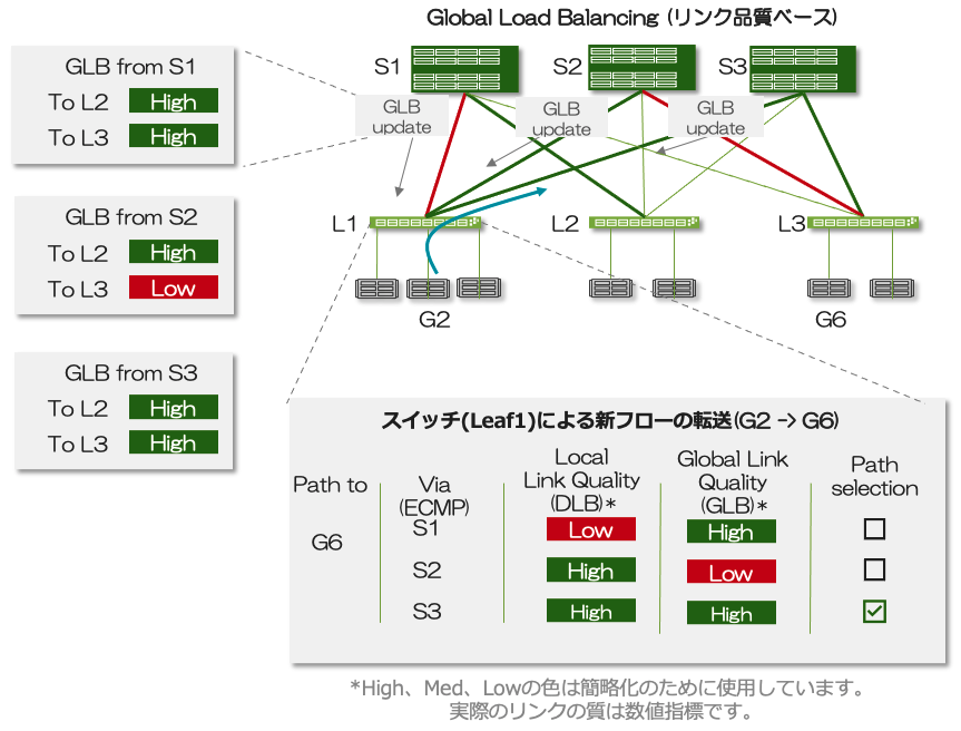 オプション 3: グローバル ロード バランシング (GLB:Global Load Balancing) では、リンク品質に関する次のホップ (NNH:Next Next Hop) 情報 (ローカル リーフだけでなく、新規または既存のフローに使用する最適なメンバー リンクを選択するスパイン リンクの機能も含む) と、リンクローカル帯域幅およびキュー サイズを含むパス選択アルゴリズムが使用されます。