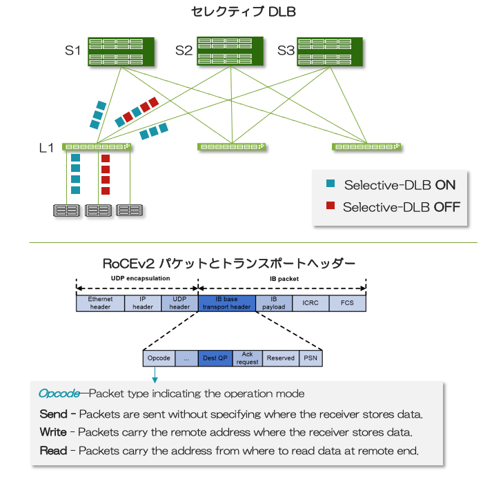 - オプション 4: DLB v2 またはセレクティブDLB により、特定のフローのみを識別して、ロードバランシングメカニズムを選択することで、特定パケットのみパーパケットのロードバランスの利用を可能にします。パーパケットのロードバランスを行う場合は、パケットのリオーダーが発生する可能性があるため、NIC側がリオーダーに対応する必要があります。特定のフローを選択するときには、InfinibandのOp-code 情報も含むこともできます。