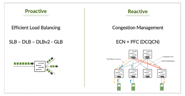 静的ロードバランシング (SLB) は、従来のイーサネット スイッチングおよびルーティングで、異なるリンク間のネットワーク トラフィックのバランスを取り、帯域幅を効果的に使用するためによく使用されます。これは、さまざまなアプリケーションが使用される従来のサーバー展開ではうまく機能しました。SLB は、パケット ヘッダーの機能からハッシュ値を計算することに基づいています。イーサネット フレームでは、Ether タイプ ヘッダーに、送信元/宛先 IP、送信元/宛先 UDP/TCP トランスポート層、およびエントロピーを持つプロトコル タイプが含まれています。この 5 つの負荷分散ハッシュは充分に思えるかもしれませんが、残念ながら、AI サーバーおよび RDMA GPU トラフィックに常に適しているわけではありません。RDMA トラフィックのエントロピーは非常に低くなります。つまり、パケット内の変動レベルが低く、フローは常に同じリンクを使用する可能性があります。SLB メカニズムは、ローカル リンクの帯域幅使用量とキューの深さを考慮せず、フローをリンクに割り当てる前にリンクの健全性をチェックしません。高帯域幅を伝送するリンクに特定のフローが割り当てられ、空きリンクが十分に活用されないままになる可能性があります。すなわち、効果的な分散が出来ずに輻輳が発生する可能性があります。これらの問題に対処するには、AI および GPU トラフィックに対して代替のロードバランシング方法を検討する必要があります。